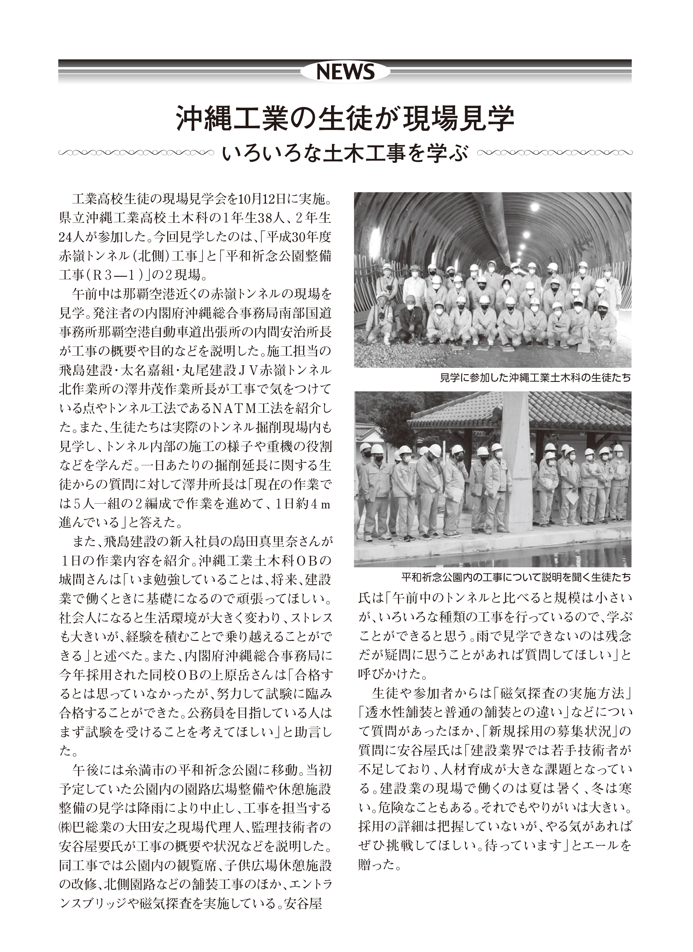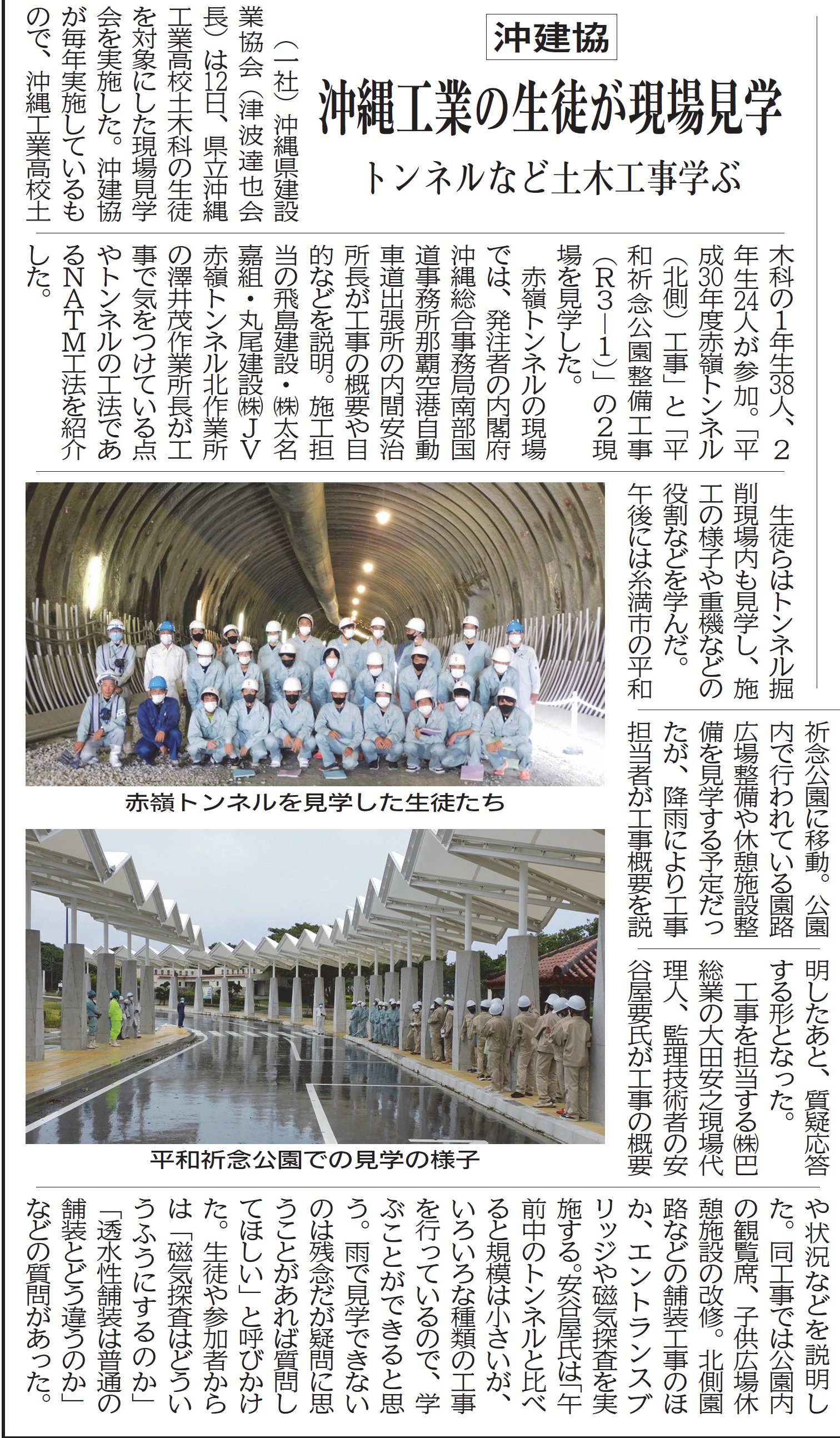 沖縄工業高校土木科の皆様が見学してくださいました! このように大きな見学会は初めてだったため、私達も緊張しておりましたが、楽しんでいただけたようで、大変嬉しく思います。 株式会社 沖縄建設新聞の皆様、一般社団法人 沖縄県建設業協会の皆様が見学会の様子を取材してくださり、記事になりましたのでご紹介させていただきます。 ○(提供)株式会社 沖縄建設新聞 様 ○(提供)一般社団法人 沖縄県建設業協会 様 今後もこのような見学会を積極的に行ってまいります。 ご所望の場合はお問い合わせにてご相談承ります。